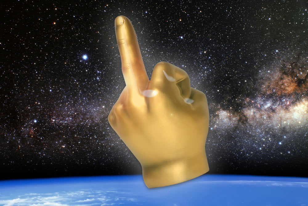 It was floating in front of them, all shiny, shimmering, glistening, looking like a million dollars and costing a hell of a lot more. It slowly spun round to reveal a completely yellow, metal face, teeth showing in a grimace of fury and one arm held out with a middle finger pointing angrily upwards. There was no doubt as to what his last words had been.