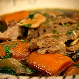 This one is a basic stew than can be made with mutton or beef, cooks slowly all morning and can be kept warm over the fire for the landlady to serve up with bread